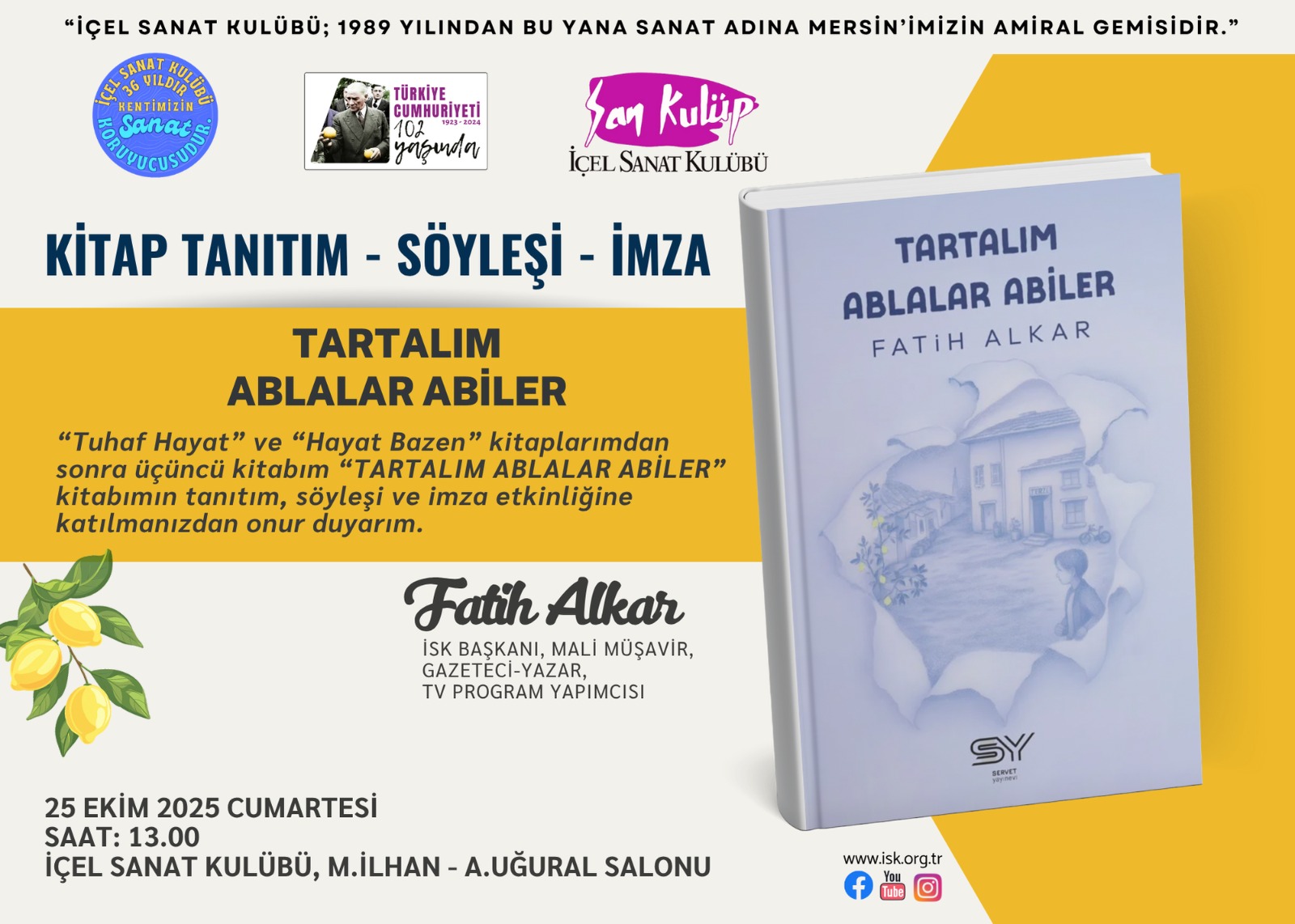 İçel Sanat Kulübü Başkanı ve Mersin SMMM Odası Basın Danışmanı Fatih Alkar, yeni kurgusal otobiyografi kitabı **“Tartalım Ablalar Ağabeyler”**i sanatseverlerin beğenisine sunmaya hazırlanıyor.