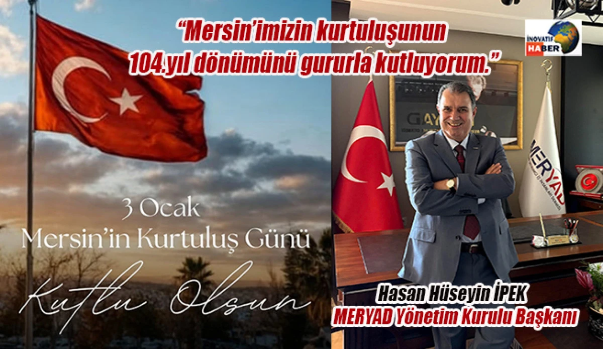 Mersin Yatırımcı İş İnsanları Derneği (MERYAD) Yönetim Kurulu Başkanı Hasan Hüseyin İpek, 3 Ocak Mersin'in Kurutuluşunu yayınladığı mesajla kutladı.