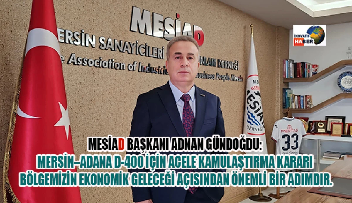 Mersin Sanayicileri ve İş İnsanları Derneği (MESİAD) Yönetim Kurulu Başkanı Adnan Gündoğdu, Cumhurbaşkanlığı kararıyla Resmî Gazete’de yayımlanan Mersin–Adana Devlet Yolu Projesi kapsamında acele kamulaştırma kararını değerlendirdi. Gündoğdu, söz konusu kararın bölge ekonomisi, ticaret ve lojistik altyapı açısından son derece önemli bir adım olduğunu vurguladı.