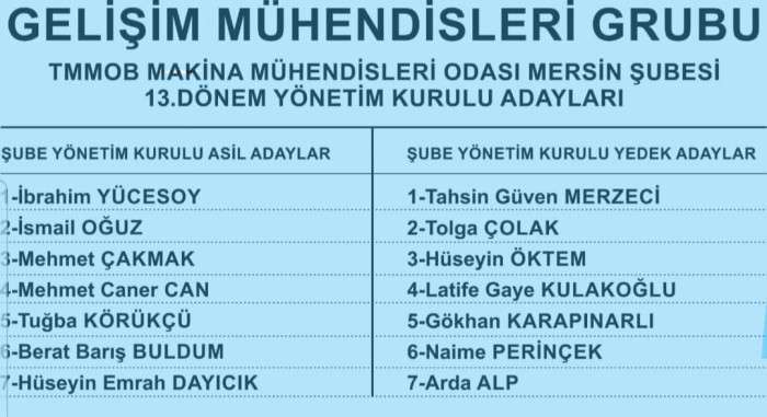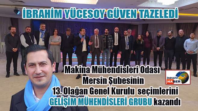 Makina Mühendisleri Odası Mersin Şubesinin 13. Olağan Genel Kurulu sonrası gerçekleşen seçimleri mevcut başkan İbrahim Yücesoy'un olduğu Gelişim Mühendisleri Grubu kazandı ve böylece bu sonuçla İbrahim Yücesoy güven tazelemiş oldu.