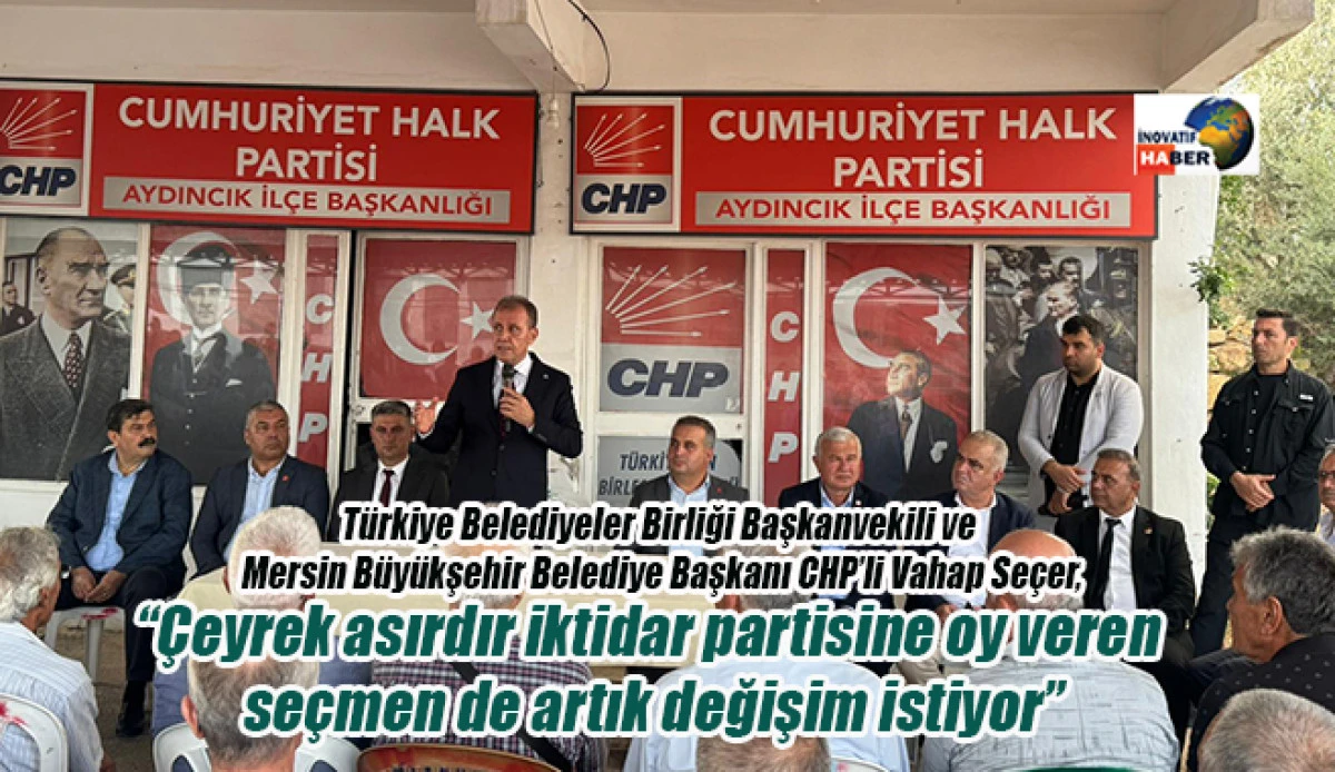 Türkiye Belediyeler Birliği Başkanvekili ve Mersin Büyükşehir Belediye Başkanı CHP’li Vahap Seçer, 24 yıldır her seçimde iktidar partisine oy veren seçmenin de artık değişim istediğini belirterek “İktidar değişikliği Türkiye’de her şeyi değiştirir. Bunun da en büyük adayı biziz, CHP. Her şey bizim elimizde” dedi. 31 Mart seçimlerinde Mersin’de yüzde 60 oy aldıklarını kaydeden Seçer, “İç cephe tahkimatı böyle olur. Anamur’un Türkmenine de oy verdirdik, Akdeniz’in Kürdüne de oy verdirdik. Aynı adama verdirdik, aynı sandıkta verdirdik. İç tahkimat sözle değil, özle olur. Vatandaş dedi ki ya insanca muamele görüyoruz. Hizmetlerde ayrım görmüyoruz. Kendimizi değerli hissediyoruz. Bu yüzden oy verdi” ifadelerini kullandı.