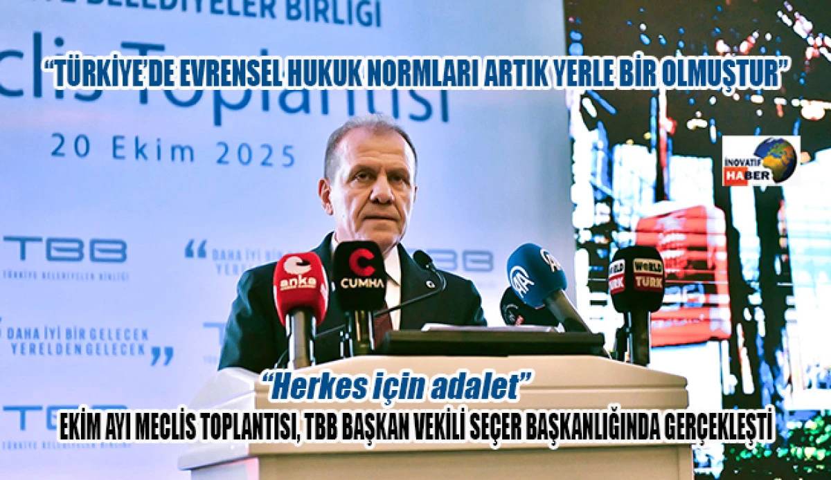 Türkiye Belediyeler Birliği (TBB) 2025 Yılı Ekim Ayı Olağan Meclis Toplantısı, TBB Başkan Vekili ve Mersin Büyükşehir Belediye Başkanı Vahap Seçer başkanlığında gerçekleştirildi. Meclis Toplantısı’nda konuşan Başkan Seçer, ülkenin içinde bulunduğu ekonomik krizden tutuklu bulunan belediye başkanları ve meclis üyelerine varana kadar, bölgede ve dünyada yaşanan gelişmelerin yanı sıra TBB’nin bu alanlardaki çalışma ve değerlendirmeleri hakkında meclis üyelerini bilgilendirdi.