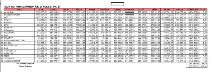2025 yılı ihracatında yer alan ilk 5 ülke sırasıyla; Almanya, Birleşik Krallık,ABD, İtalya ve Fransa oldu.