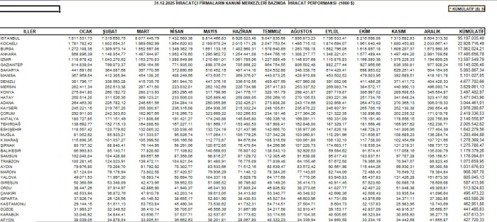 Türkiye 2025'te 273,4 Milyar Dolarla İhracatta Yeni Bir Rekora İmza Attı Geçen yıl 273,4 milyar dolara ulaşan ihracata en büyük katkıyı yine otomotiv sektörü verdi. Otomotiv, 41,5 milyar dolarla ihracat şampiyonu olurken, kimyevi maddeler 31,9 milyar dolarla ikinci, elektrik-elektronik 17,7 milyar dolarla üçüncü sırada yer aldı. Aralıkta yüzde 12,8 artan ihracat, 26,4 milyar dolarla tüm zamanların en yüksek aylık değerine ulaştı. Yıllık ihracat ise 4,5 artışla 273,4 milyar doların üzerine çıktı. 2025'te 76 ülkede 206 ticaret ve alım heyeti, 401 fuar katılımıyla ihracatçıları binlerce alıcıyla buluşturdu. 13 bine yakın yeni firma, ihracat ailesine katıldı. 8 sektör ve 27 şehir bugüne kadarki en yüksek yıllık ihracatını gerçekleştirdi. 65 ülkeye olan ihracatta en yüksek yıllk değerlere ulaşıldı.. Mal ve hizmet ihracatında 2025 yılı için belirlenen 390 milyar dolarlık hedef aşıldı. 2025 yılı ihracatında yer alan ilk 5 ülke sırasıyla; Almanya, Birleşik Krallık,ABD, İtalya ve Fransa oldu. Mersin yıllık İhracatta kümülatif toplamda 3.629.861,13 (1000 $) ile 10. sırada yer aldı