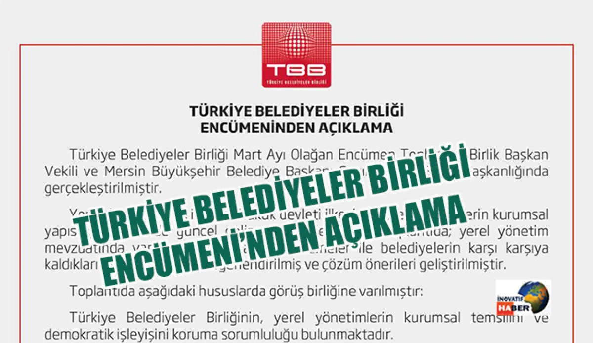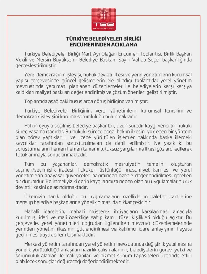 Türkiye Belediyeler Birliği Encümeni, Birlik Başkan Vekili ve Mersin Büyükşehir Belediye Başkanı Vahap Seçer başkanlığında Ankara’da gerçekleştirilen Mart Ayı Olağan Encümen Toplantısı’nın ardından yazılı açıklama yaptı. Açıklamada şu ifadelere yer verildi: