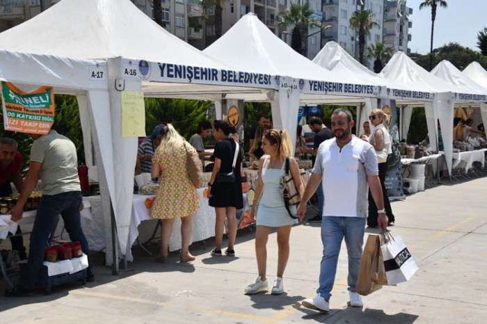 Deprem sonrası Mersin’e gelen Hataylı yurttaşlar, Hatay’ın yöresel lezzetleri, hediyelik eşyalar, el emeği takı ve tasarım ürünlerini stantlarda satışa sundu