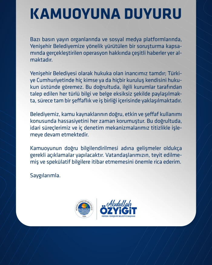Yenişehir Belediyesi olarak hukuka olan inancımız tamdır; Türkiye Cumhuriyetinde hiç kimse ya da hiçbir kuruluş kendisini hukukun üstünde göremez. Bu doğrultuda, ilgili kurumlar tarafından talep edilen her türlü bilgi ve belge eksiksiz şekilde paylaşılmakta, sürece tam bir şeffaflık ve iş birliği içerisinde yaklaşılmaktadır.